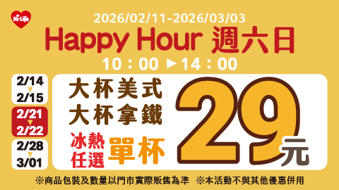 HAPPY HOUR! 週六日大杯美式/拿鐵單杯29元 限時優惠中~
