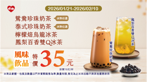 鴛鴦/泰式珍珠奶茶 檸檬/鳳梨百香等風味飲品 特價35元!